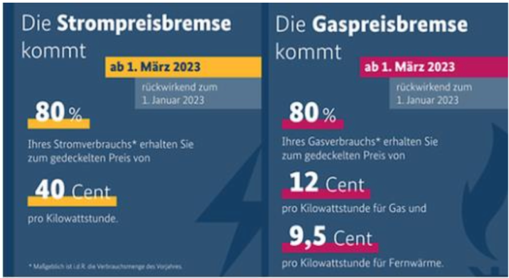 Industriekunden erhalten ab Januar 2023 von ihren Lieferanten 70 Prozent ihres Erdgasverbrauchs im Jahr 2021 zu garantierten 7 Cent je Kilowattstunde. Beim Wärmeverbrauch wird der Preis auf 7,5 Cent je Kilowattstunde gedeckelt, ebenfalls für 70 Prozent des Verbrauchs im Jahr 2021. Für den übrigen Verbrauch zahlt auch die Industrie den regulären Marktpreis.